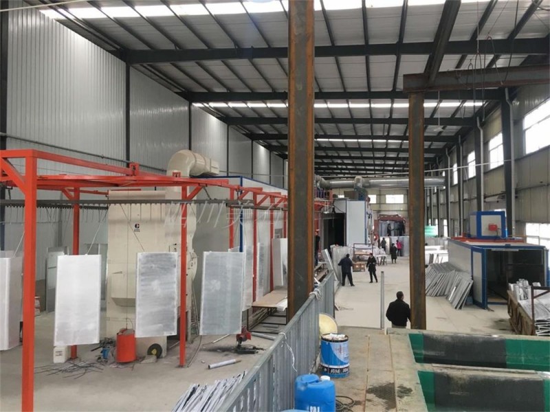 喷塑线:上件—喷淋前处理—烘干脱水—喷塑—烘干固化(20min、180℃-220℃)—冷却—下件