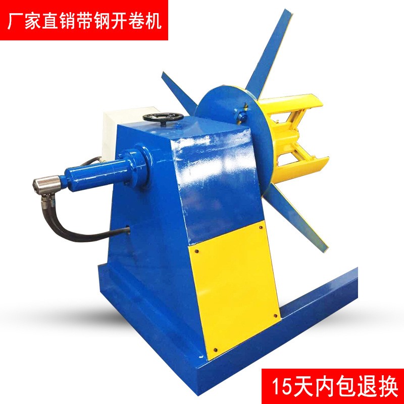 1、开卷机的主轴可将卷料进行旋转,配合开平机或纵剪机进行输送卷材。