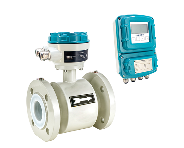 分体管道式电磁流量计由流量传感器和转换器两大部分组成。测量管上下装有励磁线圈,通励磁电流后产生的磁场穿过测量管,一对信号电极装在测量管内壁与液体相接触,产生感应电势,将流量信号传送到转换器。