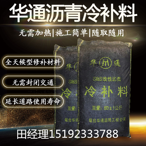 华通冷补料具有可全天候施工、操作简单、施工后可立即开放交通、浸水不松散、yong久修复。它可是路面出现坑槽时,及时有效的采取修补措施,能满足路面平整快速开放交通的需求,公司自主研发的改性沥青与5-8毫米粒径不同形状的机制砂拌和,以及材料中添加的进口冷不添加剂,增加了沥青粘膜与骨料之间的粘附力,粘性大,和易性好,可以和原路面很好的结合到一起,恢复路面的平整性。而且有抗车辙性和抗水性,夏季高温不软化低温不脆裂,保持较好稳定性,同时在雨水多季节遇水也不会出现松散、脱落现象,达到一劳永逸的效果,通过减少修补次数降低施工养护成本。