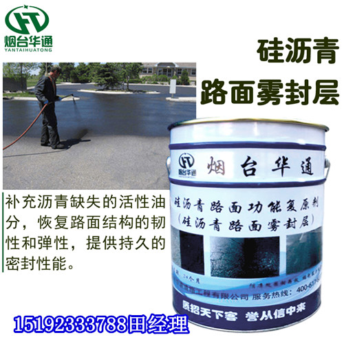 华通硅沥青雾封层在养护材料中的突出优势体现在,主要成份为硬质沥青基材料和有机硅聚合物。在接触角实验结果中显示,有机硅预防性养护材料具有良好的渗透性以及憎水性能。通过刮涂或喷涂的方法将硅沥青雾封层施工于原沥青路面,硅沥青与路面附着力强,渗透性强,可向路面细微裂缝以及空隙中补充缺失的油性油分,赋予路面密封性能。经试验:原沥青试件渗水系数是227毫升/分钟,试件涂布硅沥青雾封层后渗水性为0,另外可以使得重复冻融循环后的沥青混合料的劈裂强度比提高,增强沥青混凝土的稳定性及抗变形扭曲性能,表明硅沥青雾封层对沥青路面具有良好的防水效果。