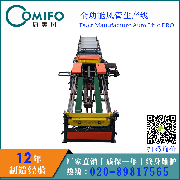 此风管生产线是我司销量z大的设备之一,直线型加工,占地面积小,生产效率高,只需一名操作人员,直接输入尺寸,生产线自动完成,日加工能力可达2000平方米,适合风管规模化加工。