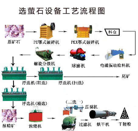 萤石浮选设备主要包括:破碎机,球磨机,分级机,搅拌筒,浮选机等。