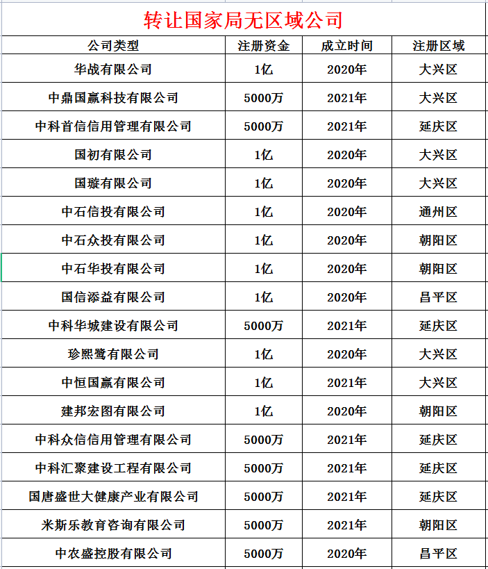 转让中字头、国字头无区域科技公司;国家局公司是不带区域的,听着就比较高大上,我们一般注册公司都是前面带区域的,比如北京某某科技有限公司;这样的名称是由地方工商局核准的,像某某科技有限公司,它是在国家局网站上核名之后在到窗口审核。而且现在国家局核名不可以在北京落地了,现在只能是在外地落地了,要是就在北京落地的话需要走渠道可以办下来,现在手里有几个国家局公司转让;需要的可以联系我!