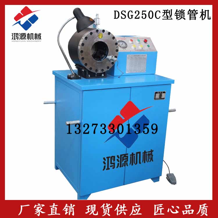 DSG-250C型锁管机适用于工农业和工程机械液压传动用高压胶管、纤维管、塑料管总成的扣压加工。具有体积小、重量轻、功能多、开模快、易操作、好维修等优点。