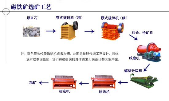 由于矿石磁性强、好磨好选,国内磁选厂均采用阶段磨矿和多阶段磨矿流程,对于粗粒嵌布的磁铁矿采用前者(一段磨矿),细粒、微细粒嵌布的磁铁矿采用后者(二段或三段磨矿)。